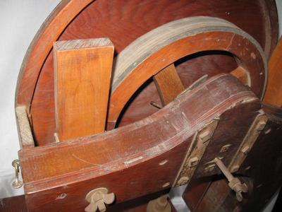 I bought this band saw at an estate sale. It is made almost entirely out of wood. There is no name on it except on the knob that is beginning to disinegrate and that says Chicago. I was wondering if you could tell me anything about it. It stands 38" tall, the base is 24 3/4" long by 8 3/4" wide. The shelf is 14 1/2" by 17 3/4". The wheels are 12 1/2" in diameter
